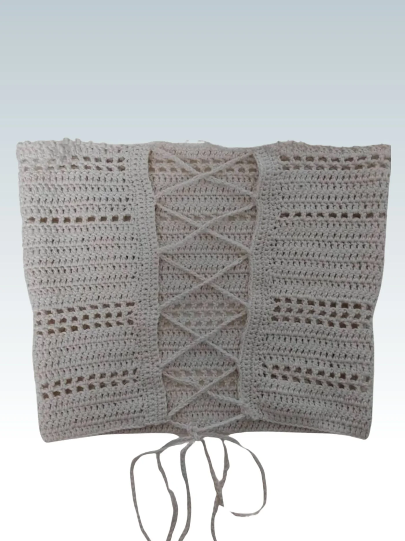 This crochet halter top features a strapless design with a halter neck option, offering a unique and versatile aesthetic. The intricate crochet patterns and soft ivory hue make it ideal for pairing with jeans, skirts, or even layered under jackets for stylish crochet outfits.